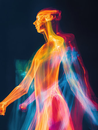 Chromatic human figure in motion: colorful aberration, artistic movement, expressive strokes, modern abstract glow, light spectrum form