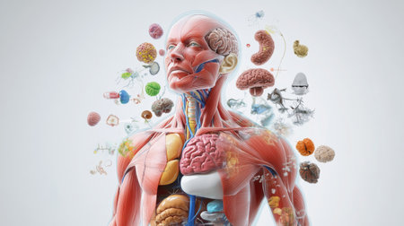 This captivating digital artwork features a stunning rendering of human anatomy, showcasing muscles and organs in vibrant colors. Ideal for educational and artistic projects.