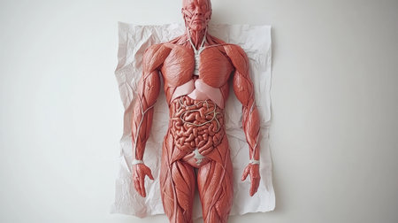 A detailed 3D model of human anatomy showcasing muscles and organs, perfect for educational purposes, medical illustrations, and anatomy study.