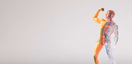 Circulatory system of 3d human body model on white background with copyspace for text. Blood and artery anatomy banner.