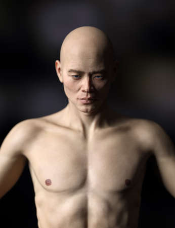 Topless bald athletic asian man. Low key studio portrait. 3D rendering.