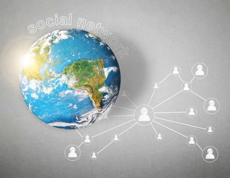 Social media network connection, people icons and planet earth globe. Global internet technology and online data exchange.