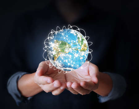 A woman's hand was holding a globe and there is a light spot that is connected in a network. Environment concept and world guardian organization. Earth image courtesy of NASA.