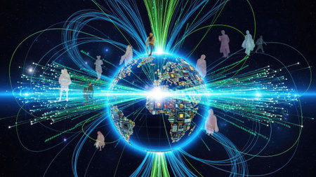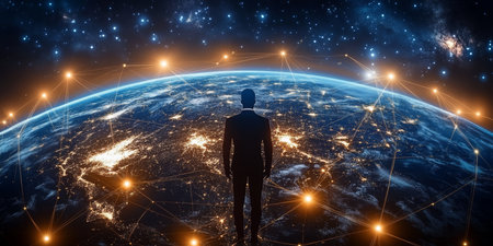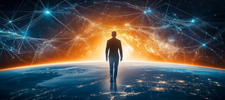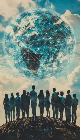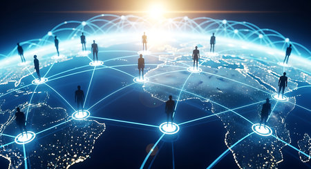 Silhouettes of people stand on glowing nodes connected by blue lines across a dark Earth illuminated by city lights and a bright sun.