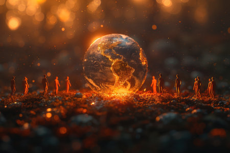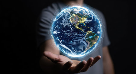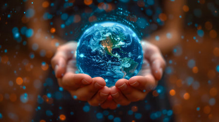 Person gently cradles a luminous Earth globe that radiates golden light, symbolizing global interconnectedness. The detailed map of the world reflects cities and continents, evoking thoughts of unity, technology, and progress. Generative AI
