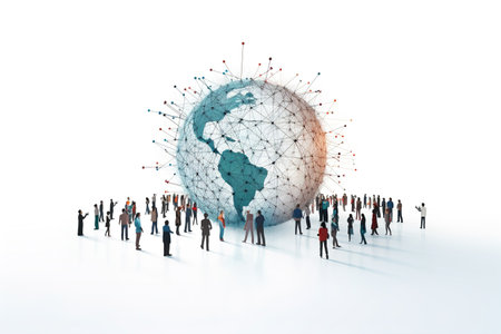 This image depicts a globe surrounded by interconnected lines and human silhouettes, symbolizing global networks. The scene features bright blue and green light emanating from the center. It could be used in various commercial projects, such as those related to technology, communication, or globalization, to convey abstract concepts.