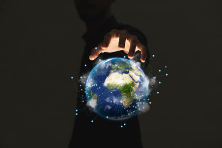 Man hands hug global network and data customer connection. Discover the captivating world of global network connections and innovative technology. Creativity and modern concepts