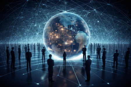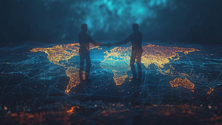 Intricate global business network, silhouetted figures stand connected by glowing lines on a world map