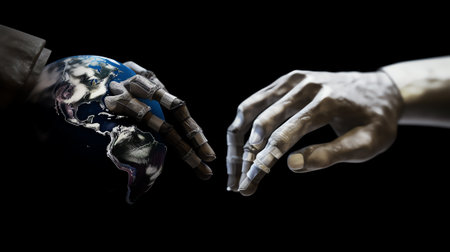 Generative AI : Astronaut in glove and robot hands in space Earth planet on background Technology and space flight Elements of this image furnished by NASA