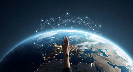 A human hand with a watch reaches up to touch a glowing, geometric network of light and connections that hovers over planet Earth at night. The image represents concepts of global communication, digital networking, internet, and the interconnectedness of people and technology.