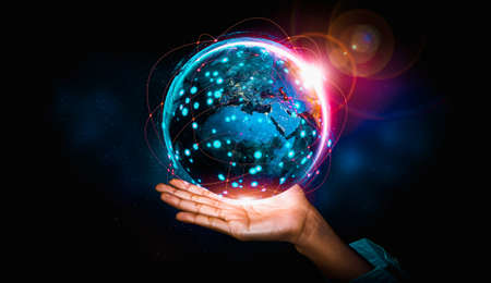 Abstract science digital connection around the world in hand on morning sky background The composition of this image was decorated by NASA.