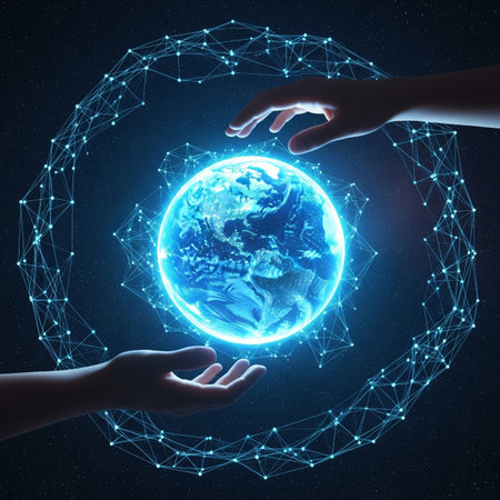A human hand gently cradles a transparent, glowing blue globe, showcasing illuminated digital continents and intricate network lines across its surface.