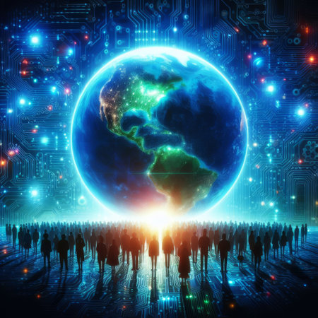 Futuristic image depicting a glowing Earth superimposed on a circuit board background with a crowd of silhouettes approaching, symbolizing global connectivity.. AI Generation