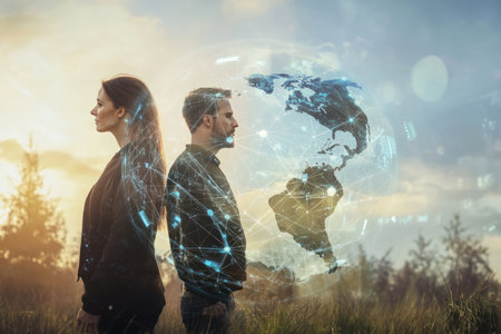 Two people stand back to back in a peaceful outdoor setting, with a digital globe overlay and sunset colors in the sky.