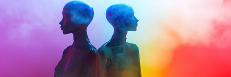 Two glossy mannequins dressed in modern outfits stand confidently in a surreal environment filled with colorful fog, creating a striking visual effect.