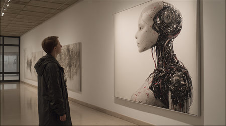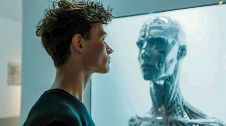 In a profile view, a man and a robot face each other, highlighting the concept of human versus AI.