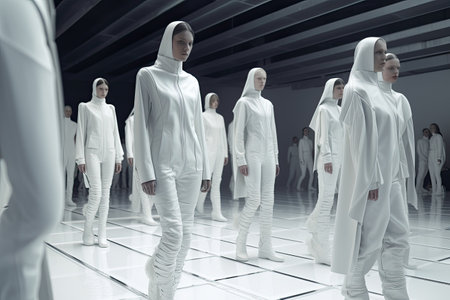a group of people in white suits and hoods standing on the floor with their heads turned to the camera