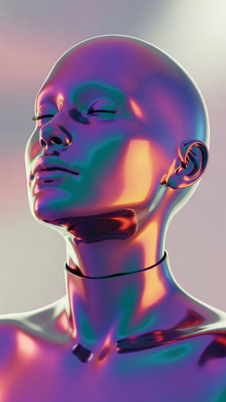 Futuristic 3D Render of a Serene Metallic Humanoid Head with Iridescent Holographic Skin and Reflective Surface