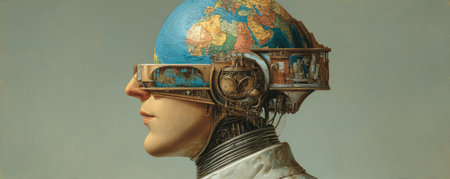 Innovative fusion of a clear humanoid head and Earth, symbolizing global innovation