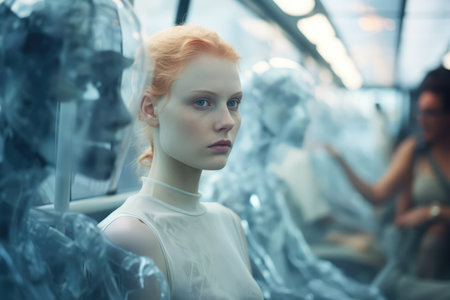 A woman stands in front of a painting featuring the face of another woman, Human Kind by Refik Anadol, AI Generated