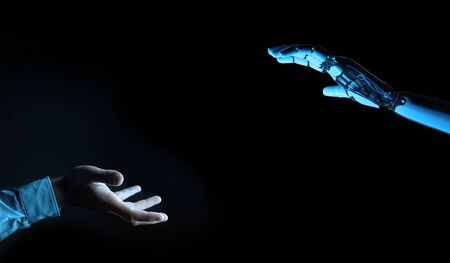 White cyborg hand about to touch human hand on dark background 3D rendering