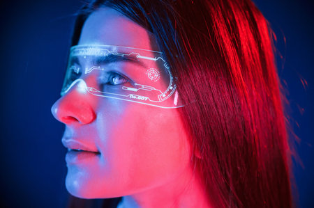 In futuristic eyewear. Young beautiful woman is indoors in the studio illuminated by neon light.