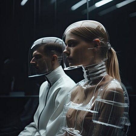 side view of futuristic man and woman looking at each other in futuristic glasses