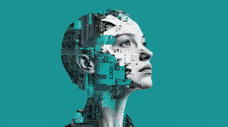 Confident young adult portrait with digital circuitry overlay blending human and technology