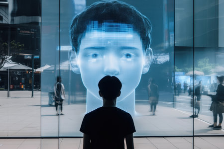 A young individual stands in front of a large digital face display while exploring an urban area during the day.