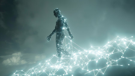 This striking image showcases a futuristic human figure composed of digital circuits and light particles, symbolizing the intersection of technology and humanity.