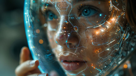 Close-up of an iridescent futuristic human face with holographic reflections and digital textures, displaying a serene expression and realistic details, reminiscent of artificial intelligence