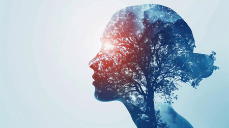 A stunning blend of human silhouette and nature creates an ethereal scene, featuring a hazy landscape with mist and trees, evoking calmness and contemplation.