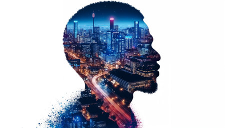 This artistic image features a human silhouette filled with a vibrant cityscape, symbolizing the connection between people and urban life, echoing creativity and dreams.
