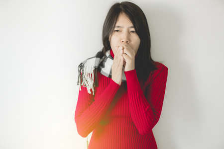 Asian woman coughing with sore throat,Female suffering with cough a lot on white background