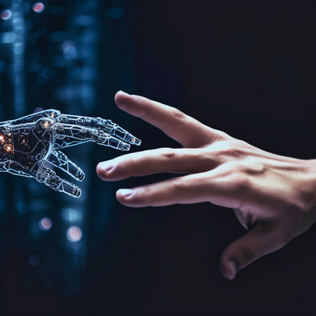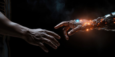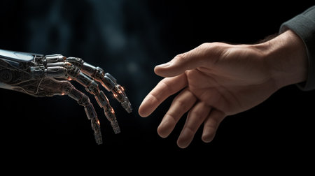 A hand reaching out to touch a robot arm, AI