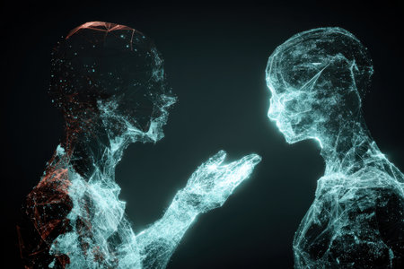 Hologram representation of agentic autonomy in a futuristic dialogue between two digital figures conveys exploration of identity and human-like interaction