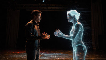 Theater illusion scene showcases a lead actor engaging with a holographic costar medium shot highlighting emotional exchange amid a darkened stage.