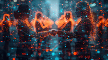 Two silhouetted hands extend toward each other, with glowing connection lines and dots highlighting the interaction in a dark environment.