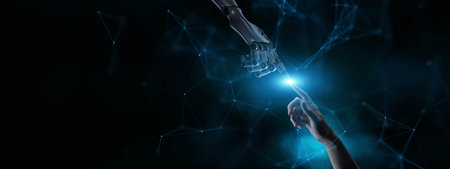 AI generative. Robot and human hands touch each other. Artificial intelligence technology concept.