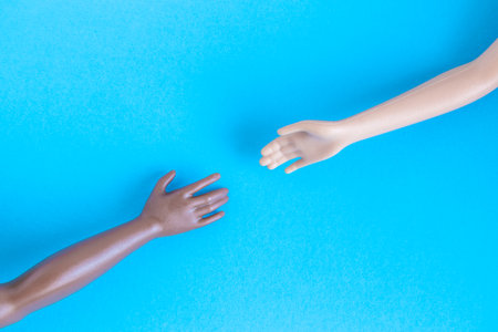 Black and white doll hands reaching toward each other. Tolerance and race diversity cooperation minimal creative concept.