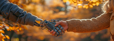 Handshake between a person with a prosthetic arm and another hand, symbolizing support. Generative AI