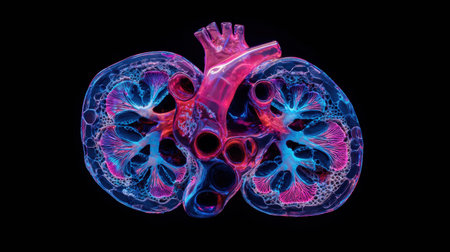 3D rendering of human kidney anatomy with detailed texture showcasing internal structures and blood vessels in high resolution. Generative AI