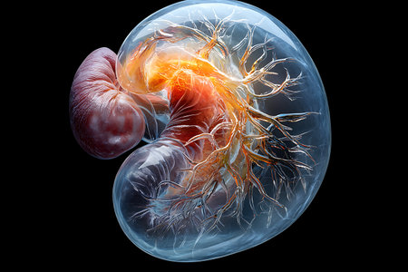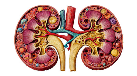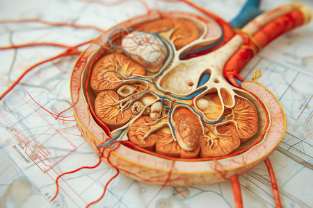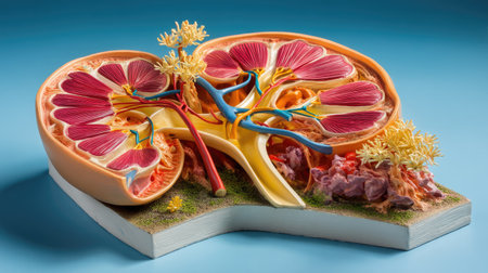 Explore a vibrant anatomical model of the human kidney, showcasing intricate details of renal structures, blood vessels, and surrounding tissues for educational purposes.