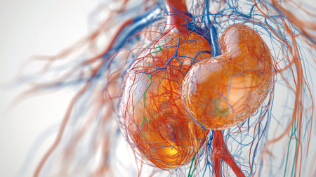 Detailed illustration of human kidneys and vascular structures, showcasing anatomy and functionality. Ideal for educational and medical purposes.
