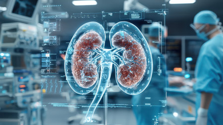Futuristic holographic image of human kidneys in bright blue tones