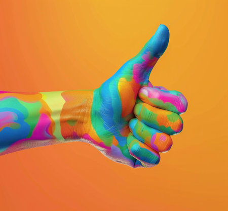 Multicolored thumbs up hand painted on orange background representing positive feedback and support