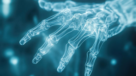 A close-up representation of a human hand skeleton highlights the intricacies of the phalanges and metacarpals