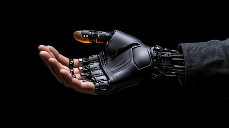 A futuristic robotic hand extends outward, symbolizing innovation and the intersection of technology and humanity. Ideal for themes of collaboration and advancement.