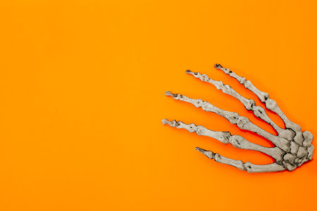 A skeletal hand is placed on a vibrant orange surface showcasing intricate details of the bones. The contrast between the hand and background creates an eye catching striking visual piece.