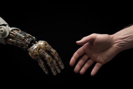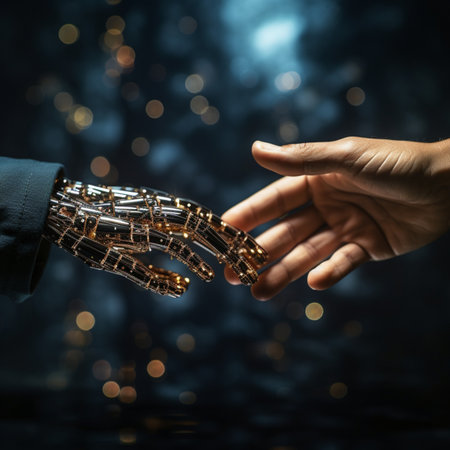 Metallic robotic fist bumps human fist exemplifying technology integration